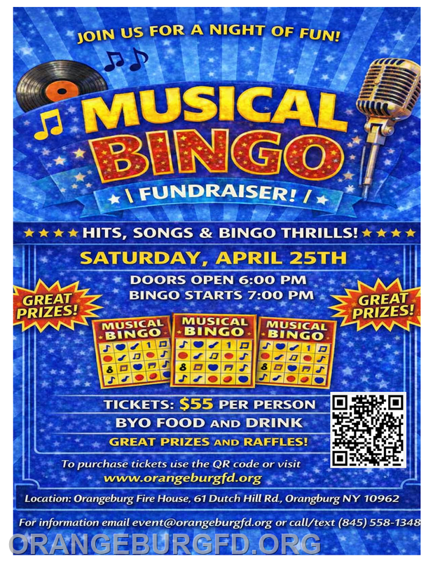Attend an evening featuring music, prizes, and raffles. This event offers an opportunity to unwind and connect with friends and neighbors in the community. Doors open at 6:00 PM, and Bingo will begin at 7:00 PM. The event will take place at the Orangeburg Fire House, located at 61 Dutch Hill Rd, Orangeburg, NY 10962. For questions or additional information, email event@orangeburgfd.org or call/text (845) 558-1348.